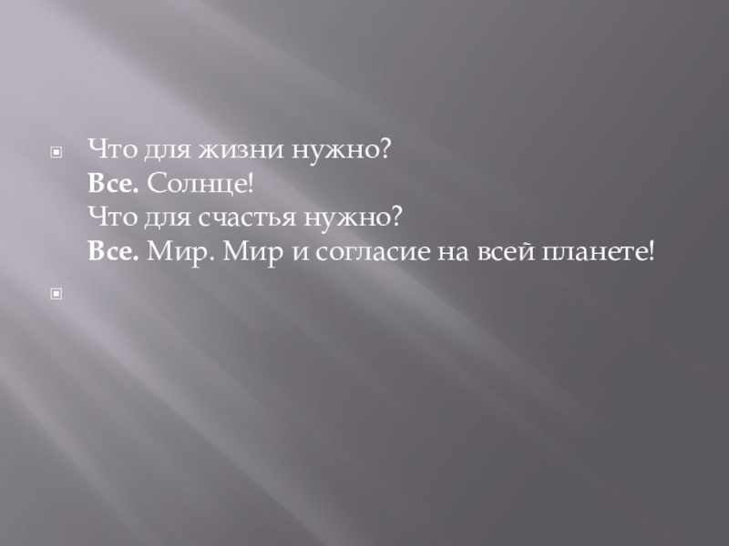 Что для жизни нужно? Все. Солнце!  Что для счастья нужно? Все. Мир. Мир и согласие на всей планете!