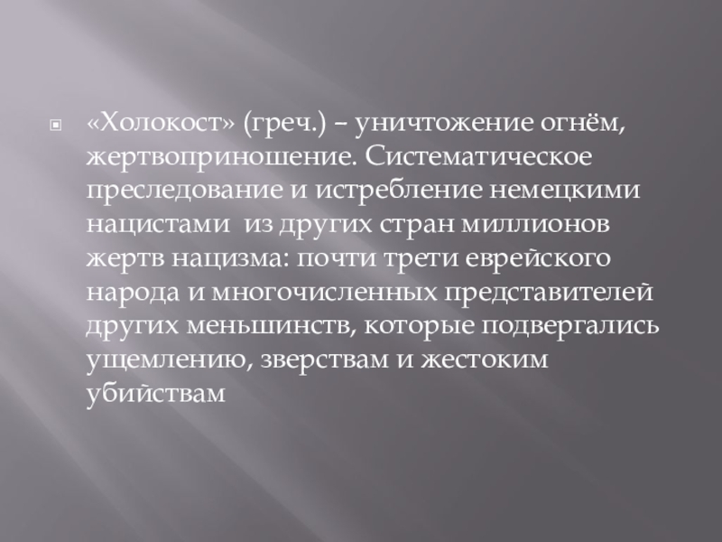 «Холокост» (греч.) – уничтожение огнём, жертвоприношение. Систематическое преследование и истребление немецкими нацистами из других стран миллионов жертв