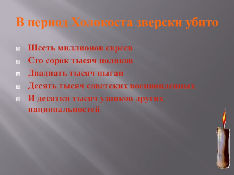 В период Холокоста зверски убитоШесть миллионов евреевСто сорок тысяч поляковДвадцать тысяч цыганДесять тысяч советских военнопленныхИ десятки тысяч