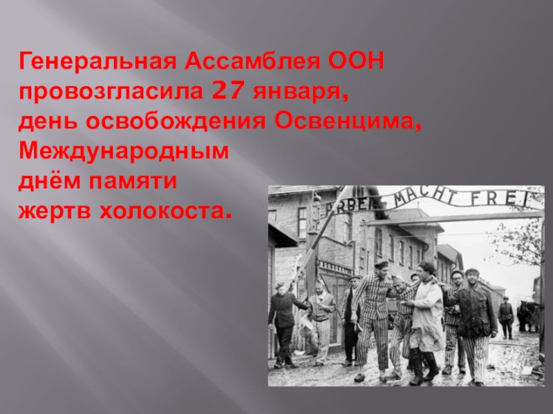 Слайд 20 Генеральная Ассамблея ООН провозгласила 27 января, день освобождения Освенцима, Международным днём памяти