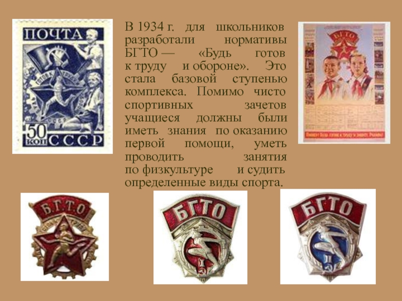 Слайд 21В 1934 г. для школьников разработали нормативы БГТО — «Будь готов к труду и обороне». Это