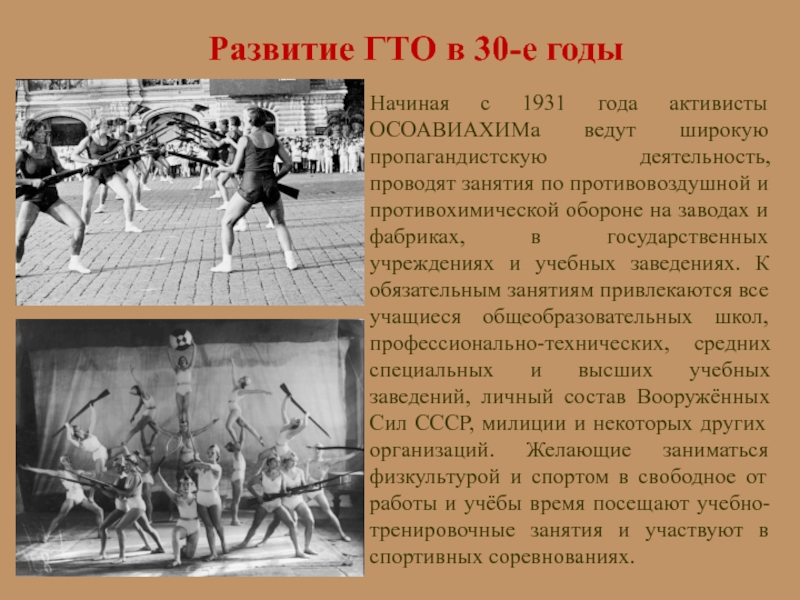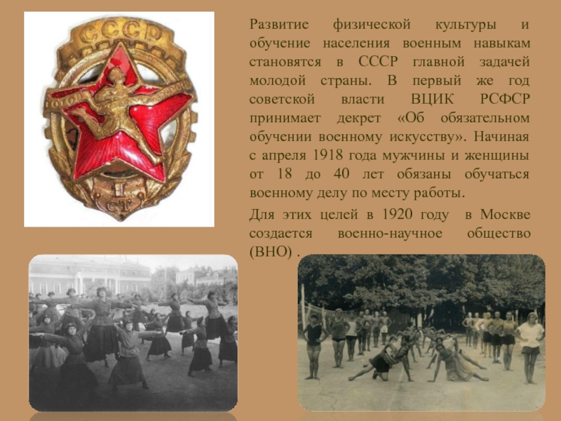 Слайд 8Развитие физической культуры и обучение населения военным навыкам становятся в СССР