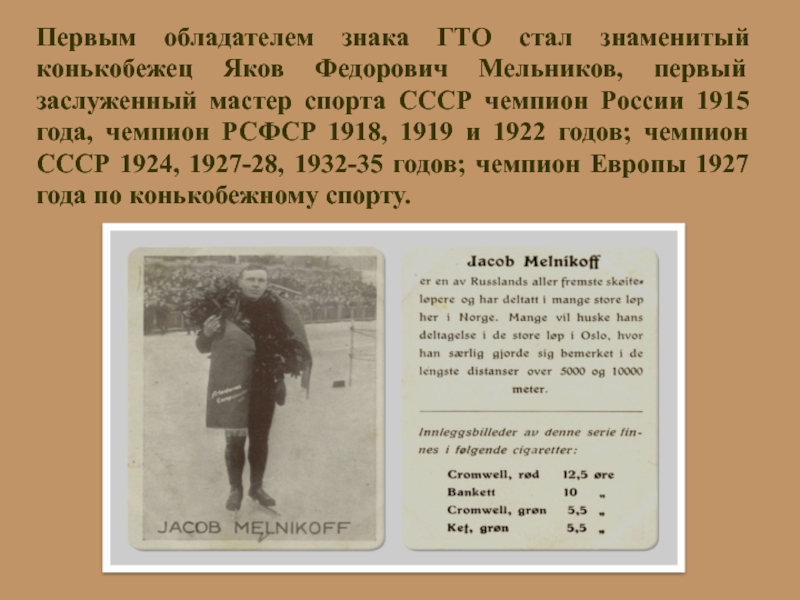 Слайд 18Первым обладателем знака ГТО стал знаменитый конькобежец Яков Федорович Мельников, первый