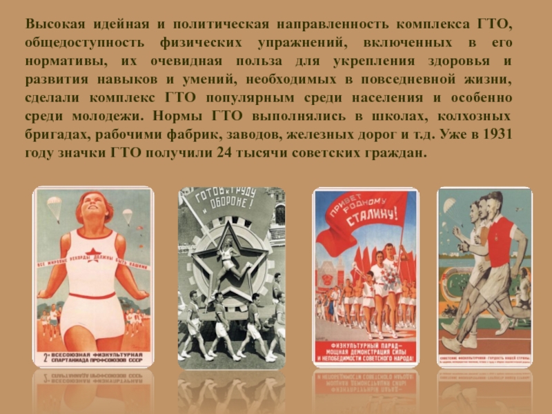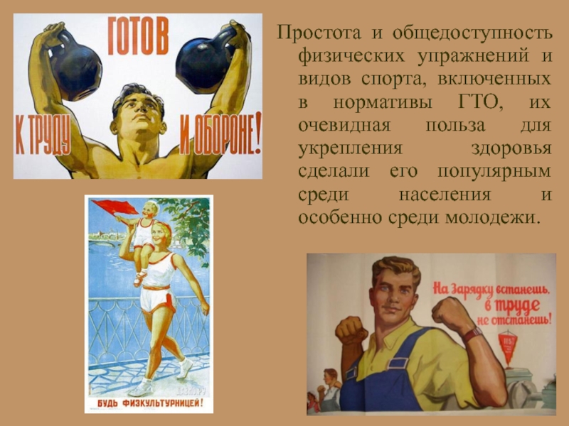 Слайд 14Высокая идейная и политическая направленность комплекса ГТО, общедоступность физических упражнений, включенных