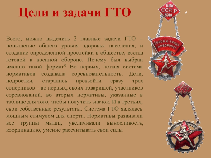 повышение общего уровня здоровья населения, и создание определенной прослойки в обществе, всегда готовой к военной обороне. Почему был выбран именно такой формат? Во первых, четкая система нормативов создавала соревновательность. Дети, подростки, старались превзойти сразу трех соперников – во первых, своих товарищей, участников соревнований, во вторых нормативы, указанные в таблице для того, чтобы получить значок. И в третьих, свои собственные результаты. Система ГТО являлась мощным стимулом для спорта. Нормативы развивали все группы мышц, увеличивали выносливость, координацию, умение рассчитывать свои силы