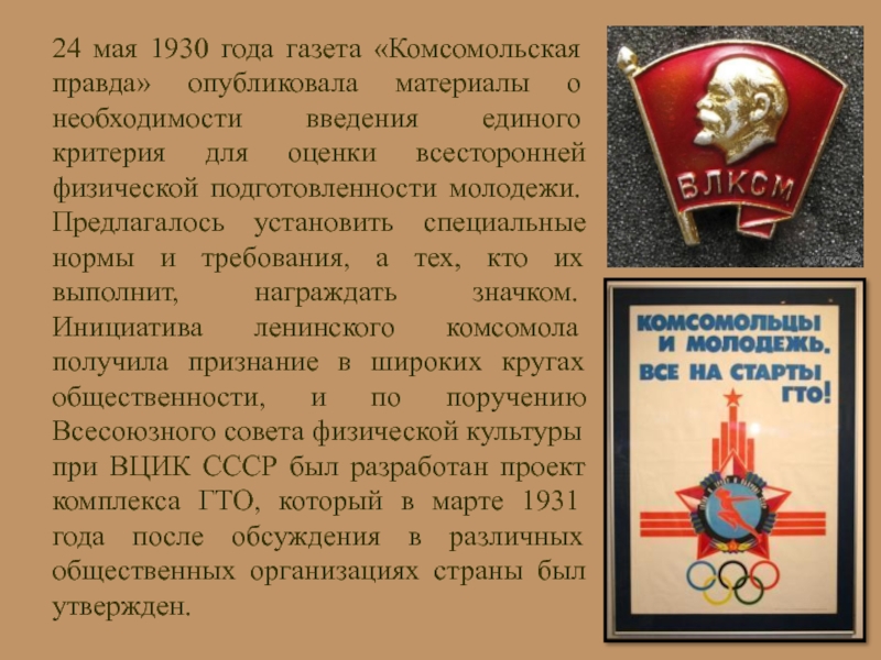 введения единого критерия для оценки всесторонней физической подготовленности молодежи. Предлагалось установить специальные нормы и требования, а тех, кто их выполнит, награждать значком. Инициатива ленинского комсомола получила признание в широких кругах общественности, и по поручению Всесоюзного совета физической культуры при ВЦИК СССР был разработан проект комплекса ГТО, который в марте 1931 года после обсуждения в различных общественных организациях страны был утвержден.