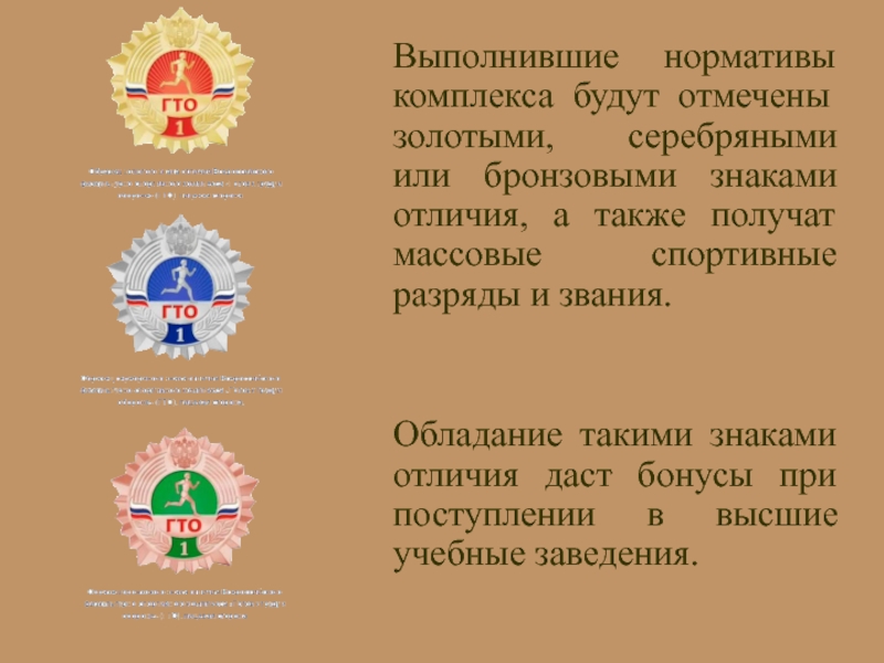 Слайд 32Выполнившие нормативы комплекса будут отмечены золотыми, серебряными или бронзовыми знаками отличия,