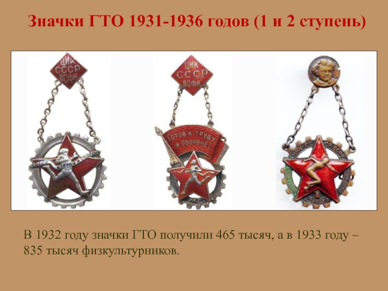 Слайд 16Значки ГТО 1931-1936 годов (1 и 2 ступень)