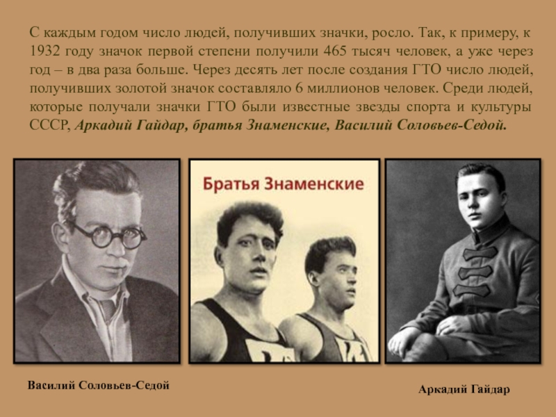 к 1932 году значок первой степени получили 465 тысяч человек, а уже через год – в два раза больше. Через десять лет после создания ГТО число людей, получивших золотой значок составляло 6 миллионов человек. Среди людей, которые получали значки ГТО были известные звезды спорта и культуры СССР, Аркадий Гайдар, братья Знаменские, Василий Соловьев-Седой.