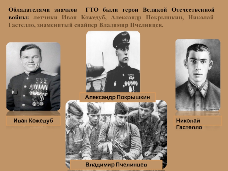 Слайд 23Обладателями значков ГТО были герои Великой Отечественной войны: летчики Иван Кожедуб,