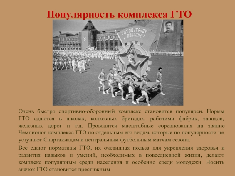 колхозных бригадах, рабочими фабрик, заводов, железных дорог и т.д. Проводятся масштабные соревнования на звание Чемпионов комплекса ГТО по отдельным его видам, которые по популярности не уступают Спартакиадам и центральным футбольным матчам сезона.