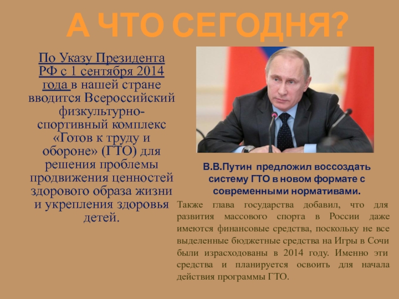 Также глава государства добавил, что для развития массового спорта в России даже имеются финансовые средства, поскольку не все выделенные бюджетные средства на Игры в Сочи были израсходованы в 2014 году. Именно эти средства и планируется освоить для начала действия программы ГТО.