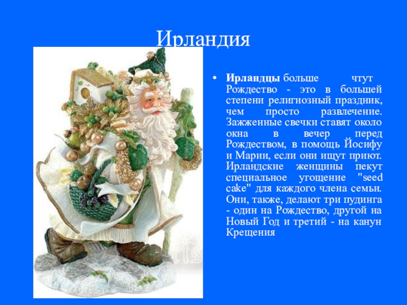 просто развлечение. Зажженные свечки ставят около окна в вечер перед Рождеством, в помощь Йосифу и Марии, если они ищут приют. Ирландские женщины пекут специальное угощение "seed cake" для каждого члена семьи. Они, также, делают три пудинга - один на Рождество, другой на Новый Год и третий - на канун Крещения