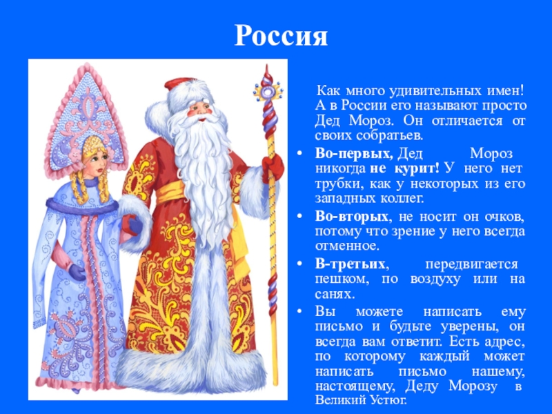Вы можете написать ему письмо и будьте уверены, он всегда вам ответит. Есть адрес, по которому каждый может написать письмо нашему, настоящему, Деду Морозу в Великий Устюг.