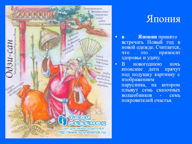 В новогоднюю ночь японские дети прячут под подушку картинку с изображением парусника, на котором плывут семь сказочных волшебников - семь покровителей счастья.