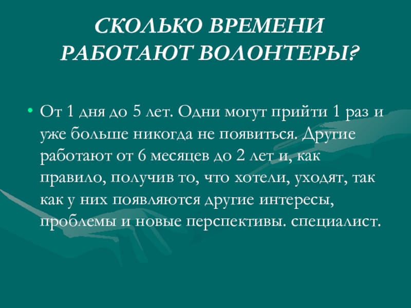 Слайд 13СКОЛЬКО ВРЕМЕНИ РАБОТАЮТ ВОЛОНТЕРЫ?