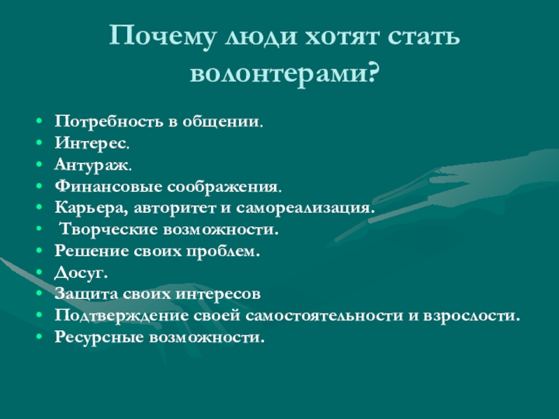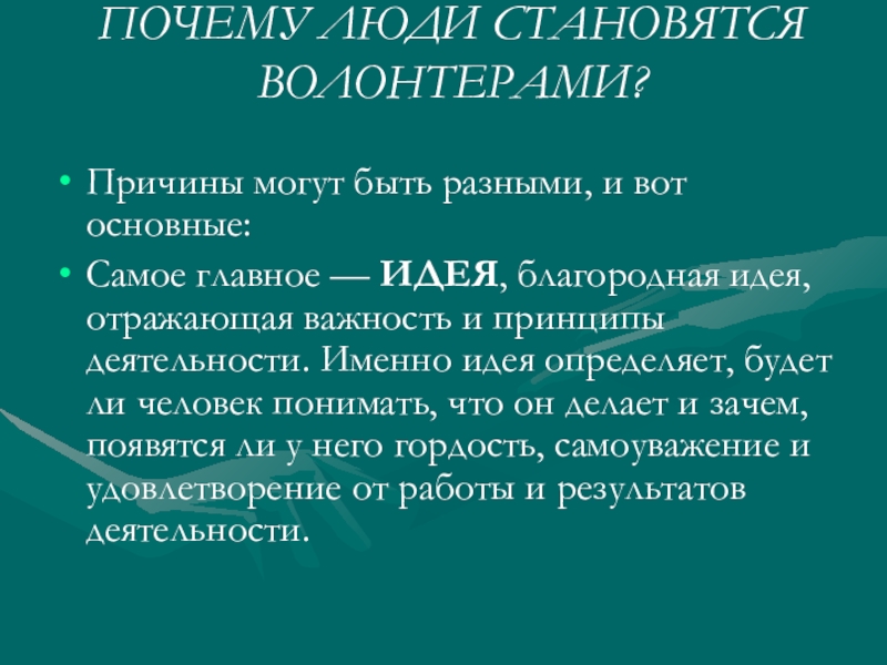 Слайд 7Почему люди хотят стать волонтерами?