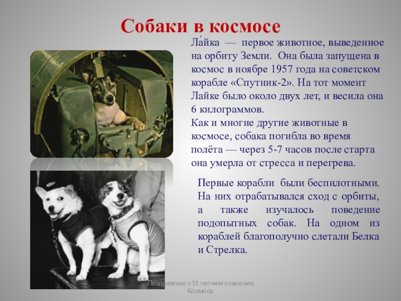 Ла́йка — первое животное, выведенное на орбиту Земли. Она была запущена в космос в ноябре 1957 года на советском корабле «Спутник-2». На тот момент Лайке было около двух лет, и весила она 6 килограммов.