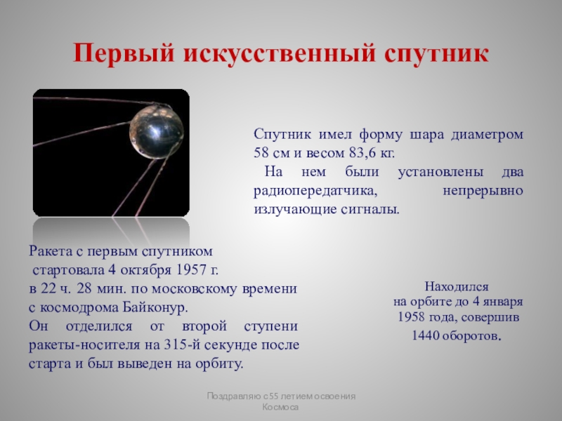 Спутник имел форму шара диаметром 58 см и весом 83,6 кг.