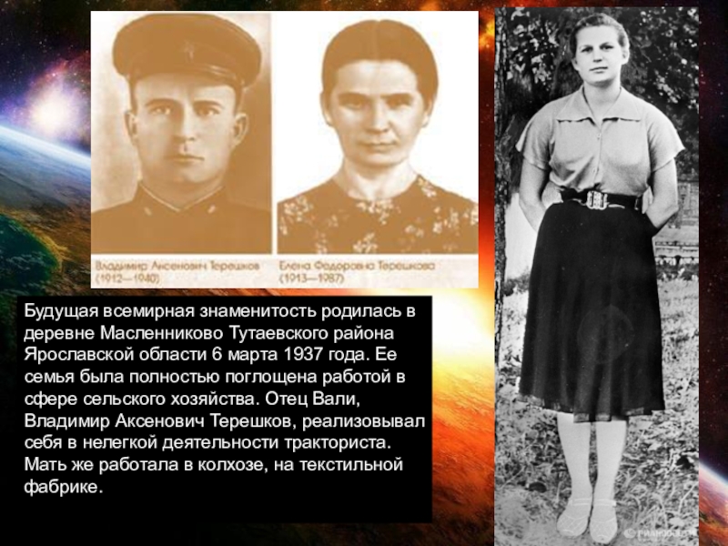 6 марта 1937 года. Ее семья была полностью поглощена работой в сфере сельского хозяйства. Отец Вали, Владимир Аксенович Терешков, реализовывал себя в нелегкой деятельности тракториста. Мать же работала в колхозе, на текстильной фабрике.