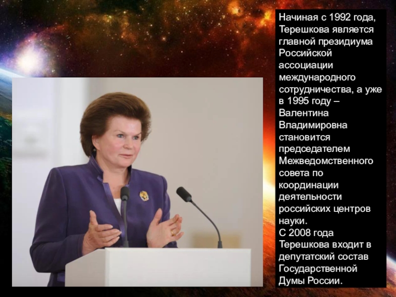 Слайд 15Начиная с 1992 года, Терешкова является главной президиума Российской ассоциации международного