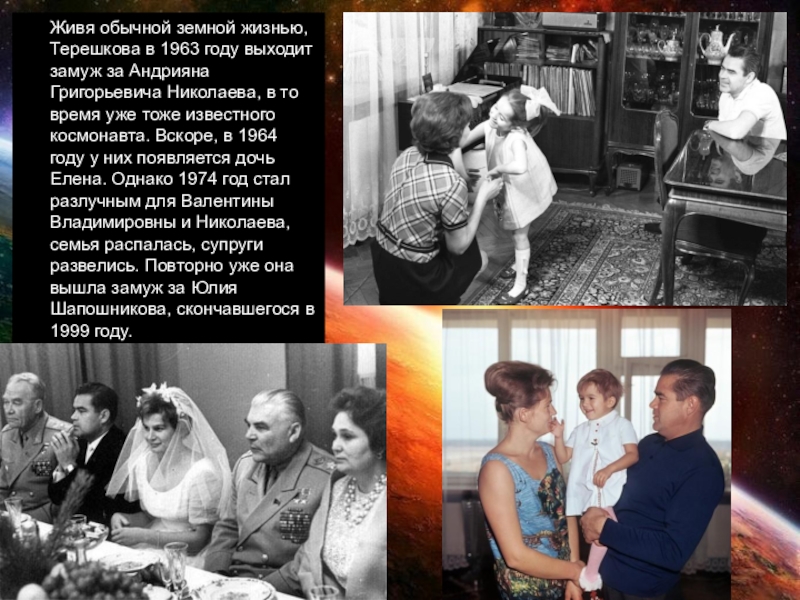 выходит замуж за Андрияна Григорьевича Николаева, в то время уже тоже известного космонавта. Вскоре, в 1964 году у них появляется дочь Елена. Однако 1974 год стал разлучным для Валентины Владимировны и Николаева, семья распалась, супруги развелись. Повторно уже она вышла замуж за Юлия Шапошникова, скончавшегося в 1999 году.