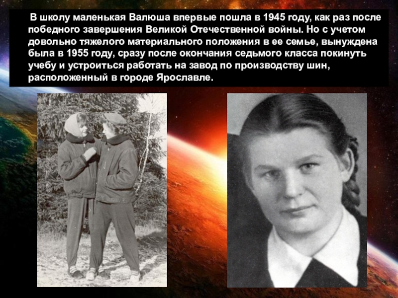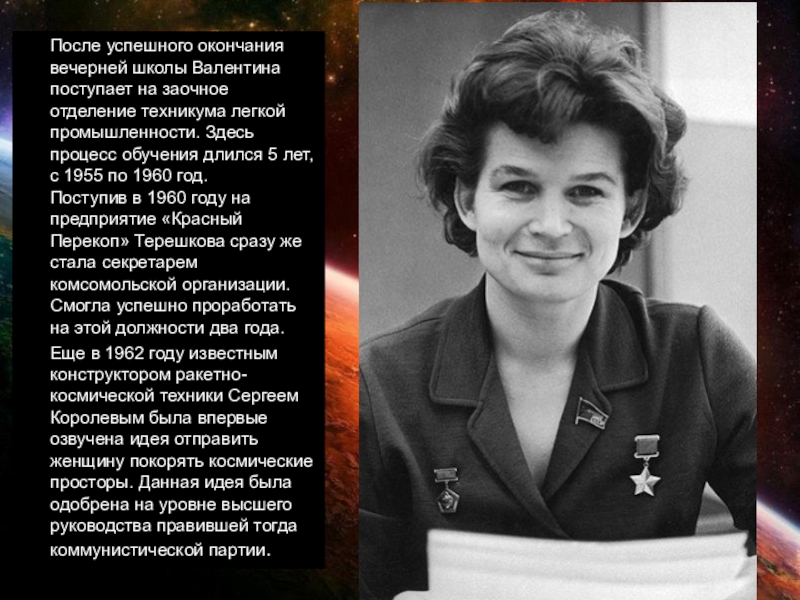 Слайд 6 После успешного окончания вечерней школы Валентина поступает на