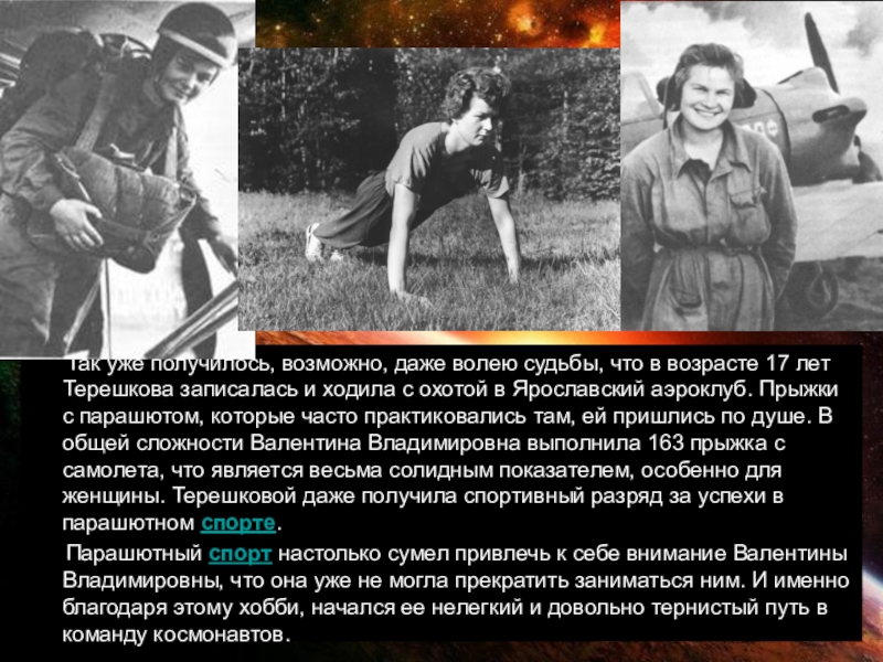 в возрасте 17 лет Терешкова записалась и ходила с охотой в Ярославский аэроклуб. Прыжки с парашютом, которые часто практиковались там, ей пришлись по душе. В общей сложности Валентина Владимировна выполнила 163 прыжка с самолета, что является весьма солидным показателем, особенно для женщины. Терешковой даже получила спортивный разряд за успехи в парашютном спорте.