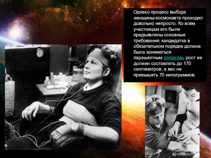 Слайд 7 Однако процесс выбора женщины-космонавта проходил довольно непросто. Ко