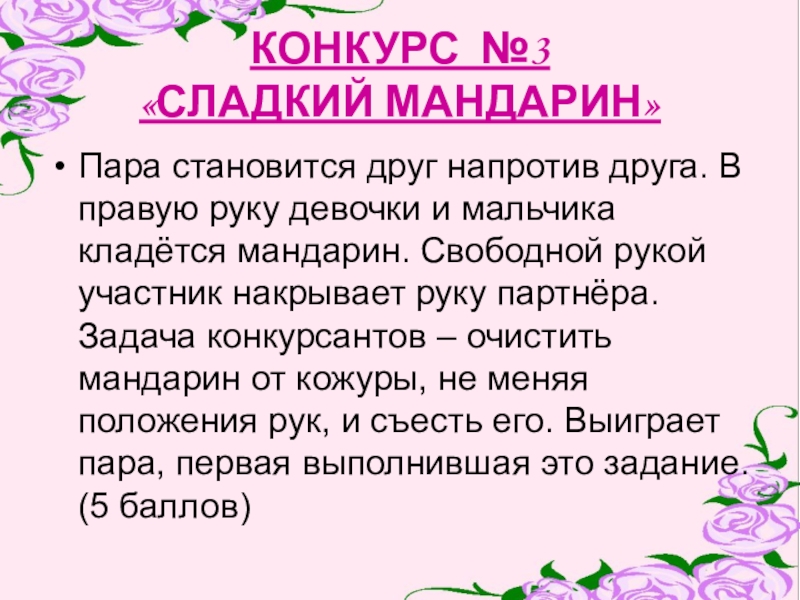 девочки и мальчика кладётся мандарин. Свободной рукой участник накрывает руку партнёра. Задача конкурсантов – очистить мандарин от кожуры, не меняя положения рук, и съесть его. Выиграет пара, первая выполнившая это задание. (5 баллов)