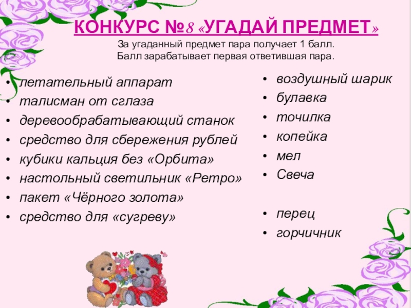 За угаданный предмет пара получает 1 балл.