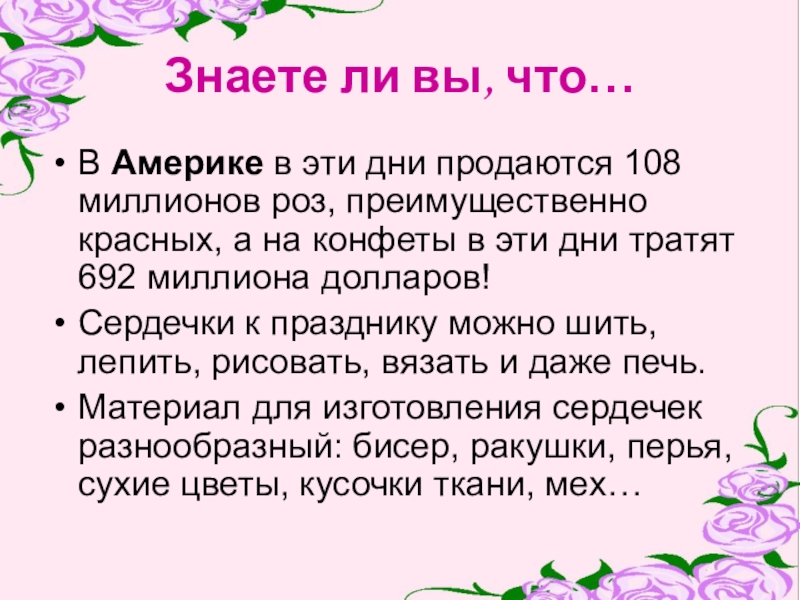 роз, преимущественно красных, а на конфеты в эти дни тратят 692 миллиона долларов!
