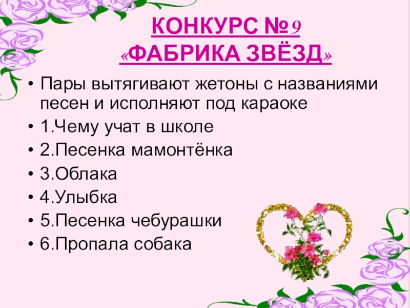 Пары вытягивают жетоны с названиями песен и исполняют
