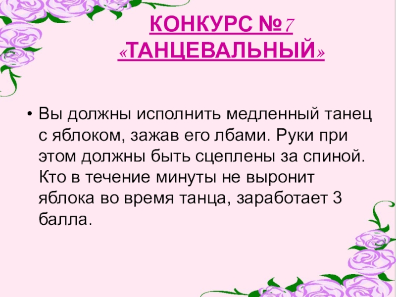 лбами. Руки при этом должны быть сцеплены за спиной. Кто в течение минуты не выронит яблока во время танца, заработает 3 балла.