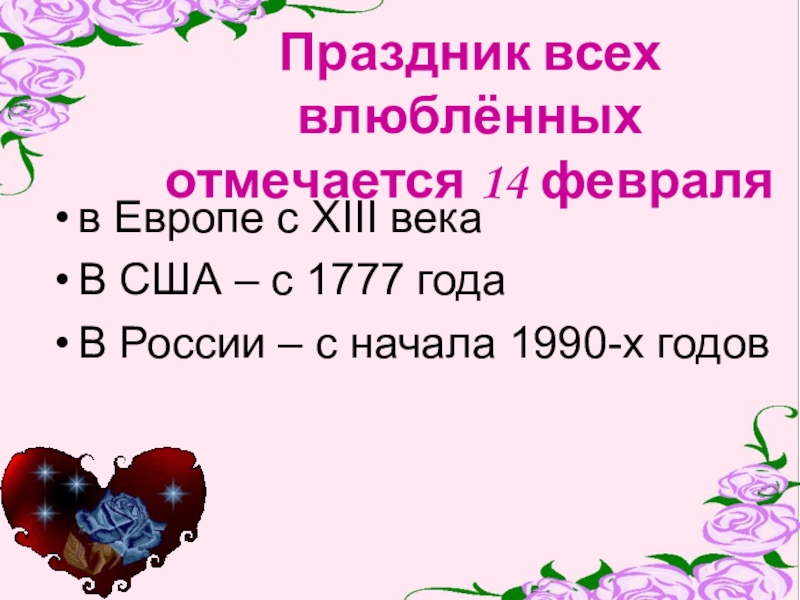 Слайд 2Праздник всех влюблённых отмечается 14 февраля