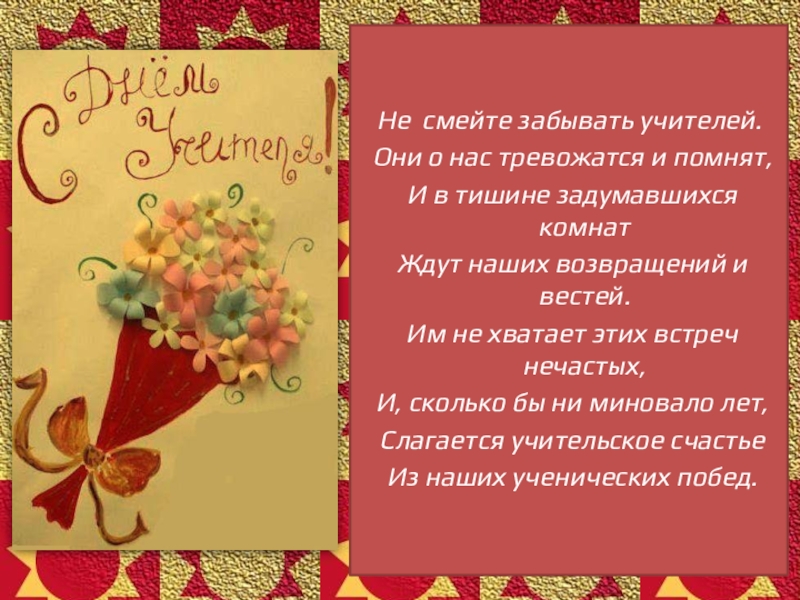 Не смейте забывать учителей. Они о нас тревожатся и помнят, И в тишине задумавшихся комнат Ждут наших