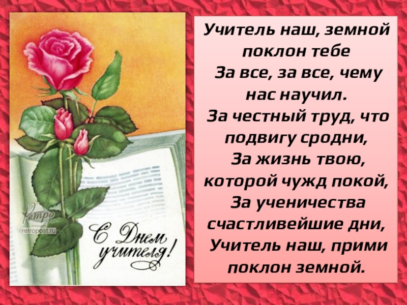 Учитель наш, земной поклон тебе За все, за все, чему нас научил. За честный труд, что подвигу