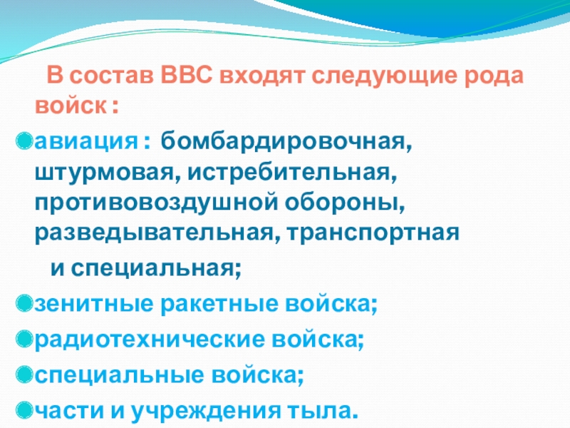 Слайд 16 В состав ВВС входят следующие рода войск :