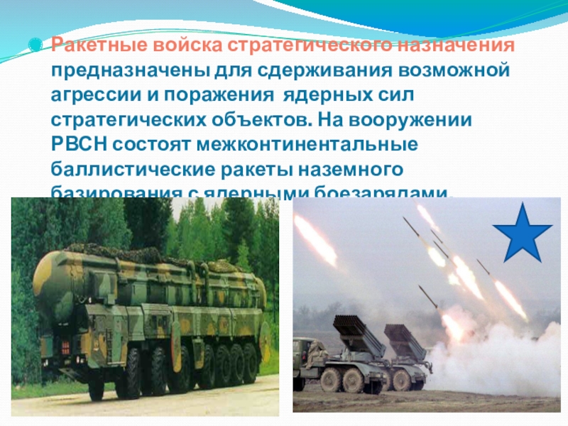 ядерных сил стратегических объектов. На вооружении РВСН состоят межконтинентальные баллистические ракеты наземного базирования с ядерными боезарядами.