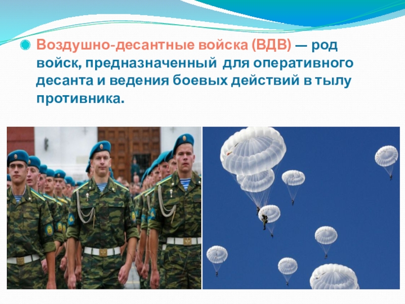 Слайд 22Воздушно-десантные войска (ВДВ) — род войск, предназначенный для оперативного десанта и
