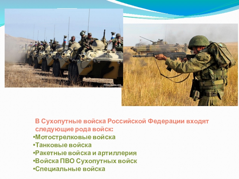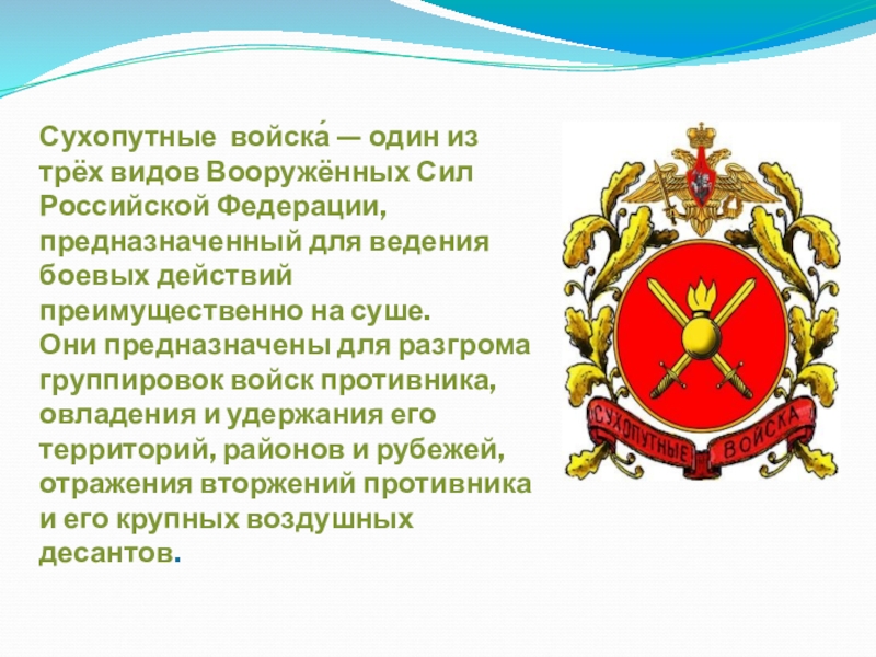 Слайд 12Сухопутные войска́ — один из трёх видов Вооружённых Сил Российской Федерации,