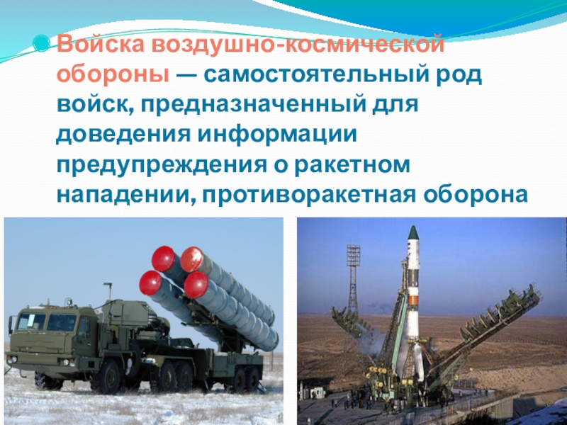 Слайд 21Войска воздушно-космической обороны — самостоятельный род войск, предназначенный для доведения информации