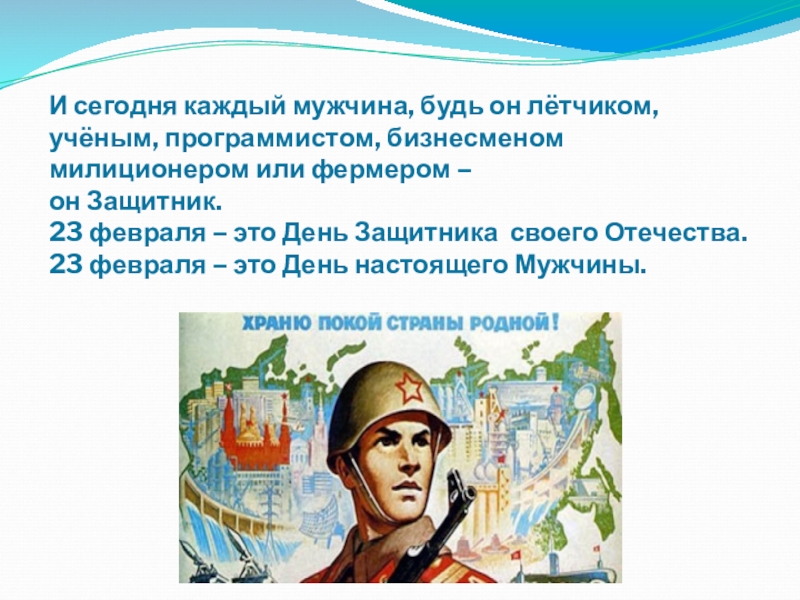 Слайд 6И сегодня каждый мужчина, будь он лётчиком, учёным, программистом, бизнесменом милиционером