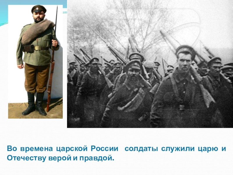 Слайд 4Во времена царской России солдаты служили царю и Отечеству верой и