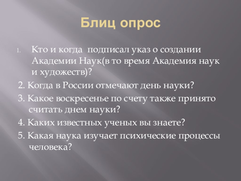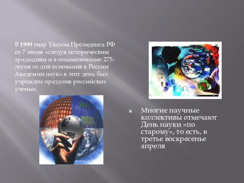 В 1999 году Указом Президента РФ от 7 июня «следуя историческим традициям и в ознаменование 275-летия со дня основания в России Академии наук» в этот день был учрежден праздник российских ученых.