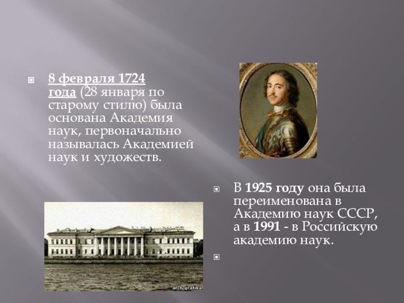 В 1925 году она была переименована в Академию наук СССР, а в 1991 - в Российскую академию наук.