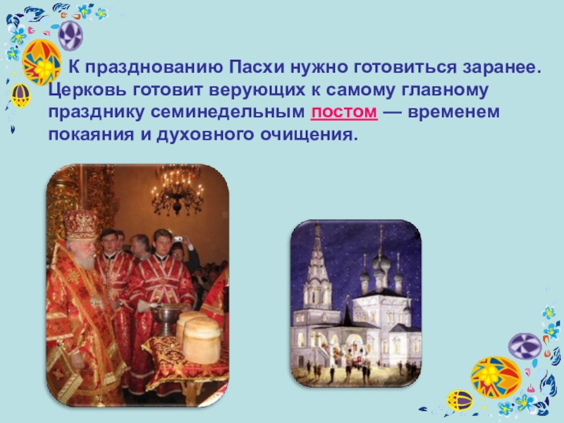 Слайд 6 К празднованию Пасхи нужно готовиться заранее. Церковь готовит верующих