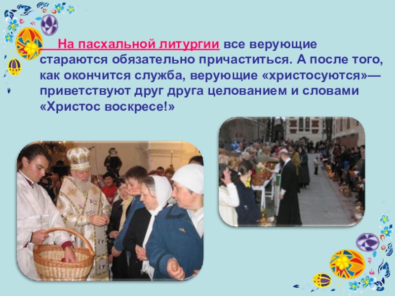 Слайд 14 На пасхальной литургии все верующие стараются обязательно причаститься.
