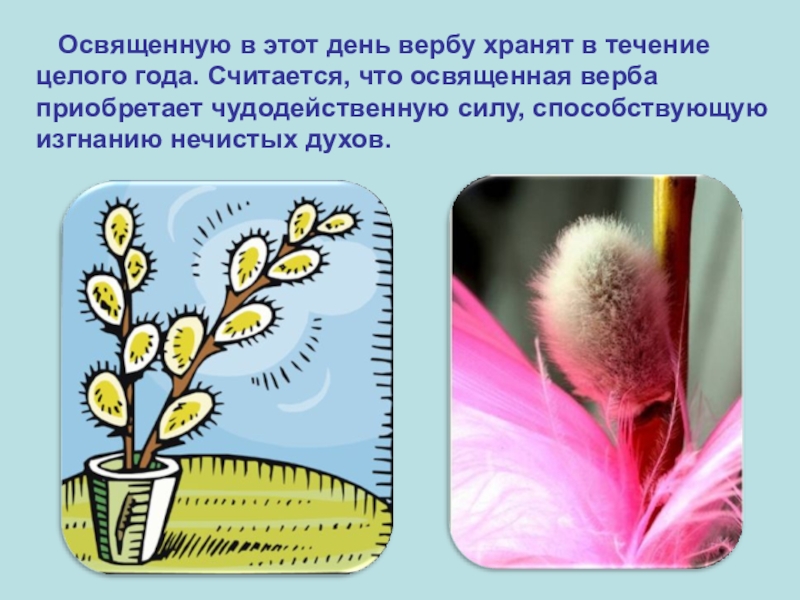 Слайд 4 Освященную в этот день вербу хранят в течение целого года. Считается,