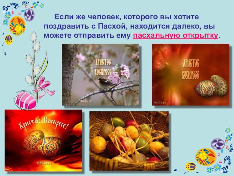 Пасхой, находится далеко, вы можете отправить ему пасхальную открытку.